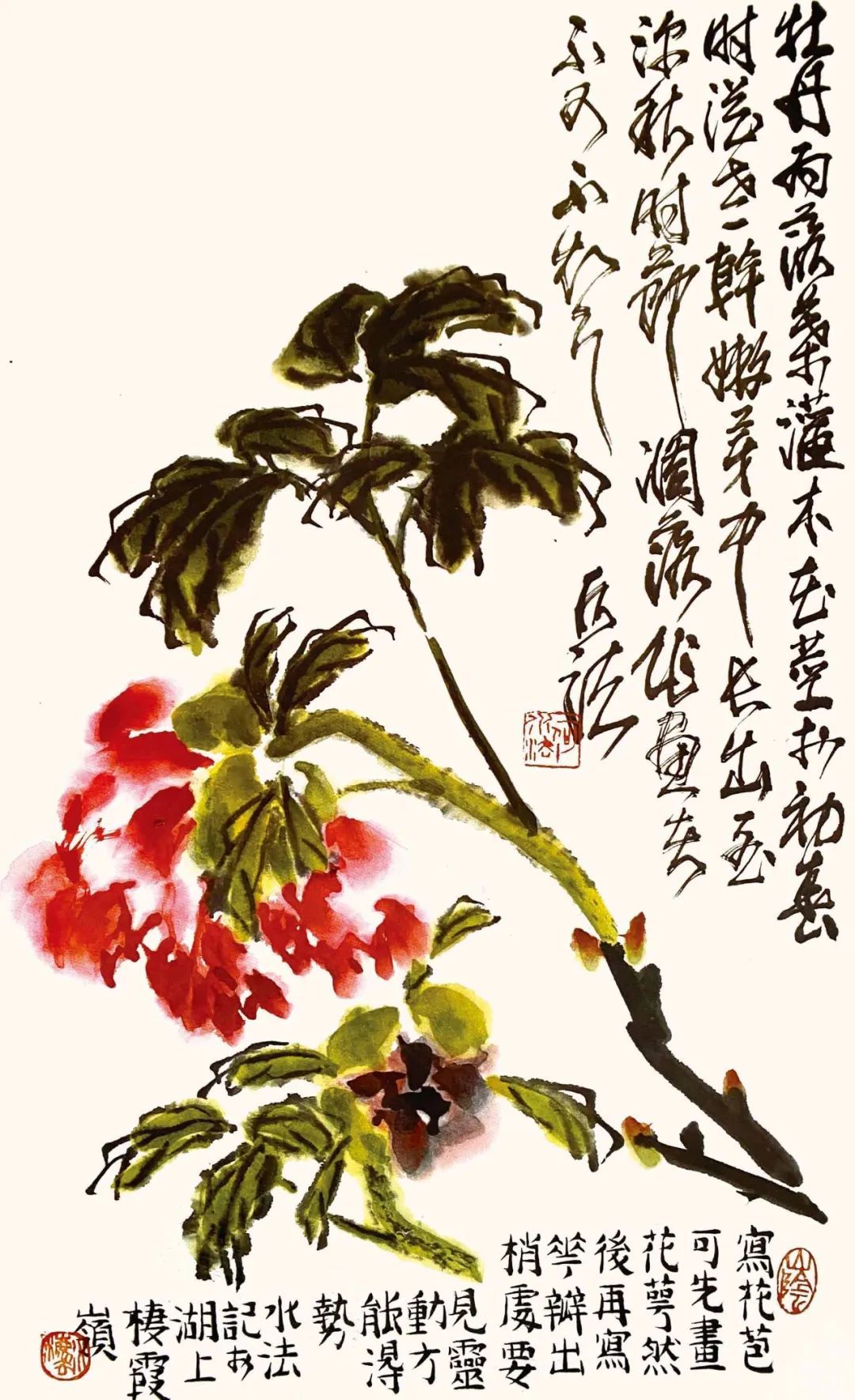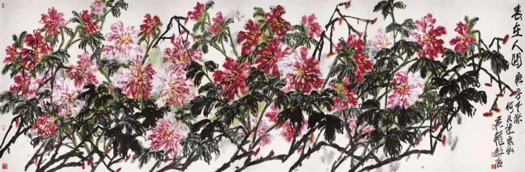 写生是画家与生活的对话,只有把花草当成老朋友,才能带着感情去看待它。我把牡丹当成老朋友,到山东菏泽、河南洛阳是见老友了,而不是单纯地去写生,是带着情怀去的。画的形也很重要,通过形体的刻画和描写,写出一种时代感。我们画梅兰竹菊不能停留在明清之前的模式,而要画出这个时代一花一草的精神,因为我们已经进入了新时代。何水法写意牡丹作品