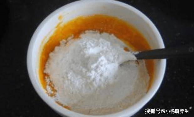南瓜泥准备好,就往里面放入适量的糯米粉和粘米粉。用手按压揉成一个团,这个面团必须是没有粉头的,不然做出来的南瓜饼难吃。