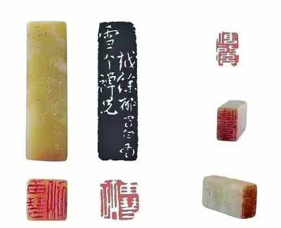 “雪衲”白文方印高3.4厘米,印面边长1厘米,四角磨秃。质地为青田石,色泽略显淡青黄色,微透,有絮状石花,稍见裂痕,总体色泽莹润,材质上佳。印面刻白文篆书“雪衲”二字,单刀浅刻行草边款“越馀郁守白为雪个禅兄”两行十字,镌刻流畅;“傳綮”白文长方印高1.6厘米,印面底部长0.9厘米、宽0.53厘米,顶部长0.8厘米、宽0.52厘米,略呈大小头状。质地为青田石,色泽呈淡青黄色,微透起冻,色泽莹润。有丝状石花,见碎裂痕。印面刻白文篆书“傳綮”二字,笔画细劲犀利,无边款。