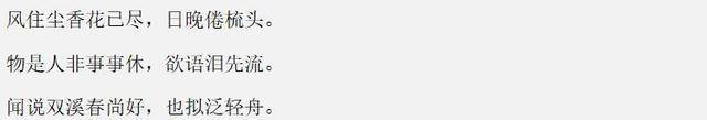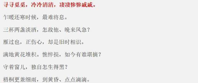 这首词写于靖康之变后,李清照遭遇了国破家亡、丈夫病逝等一系列打击。在颠沛流离的生活里,她孤单愁苦却无人可诉。伤于人事,写下了这首沉郁凄婉的诗词,开篇直接用了七个叠词“寻寻觅觅,冷冷清清,凄凄惨惨戚戚”,瞬间渲染出了这种凄凉愁苦的氛围。这句名传千古的诗词,成了李清照婉约词的代表作。
