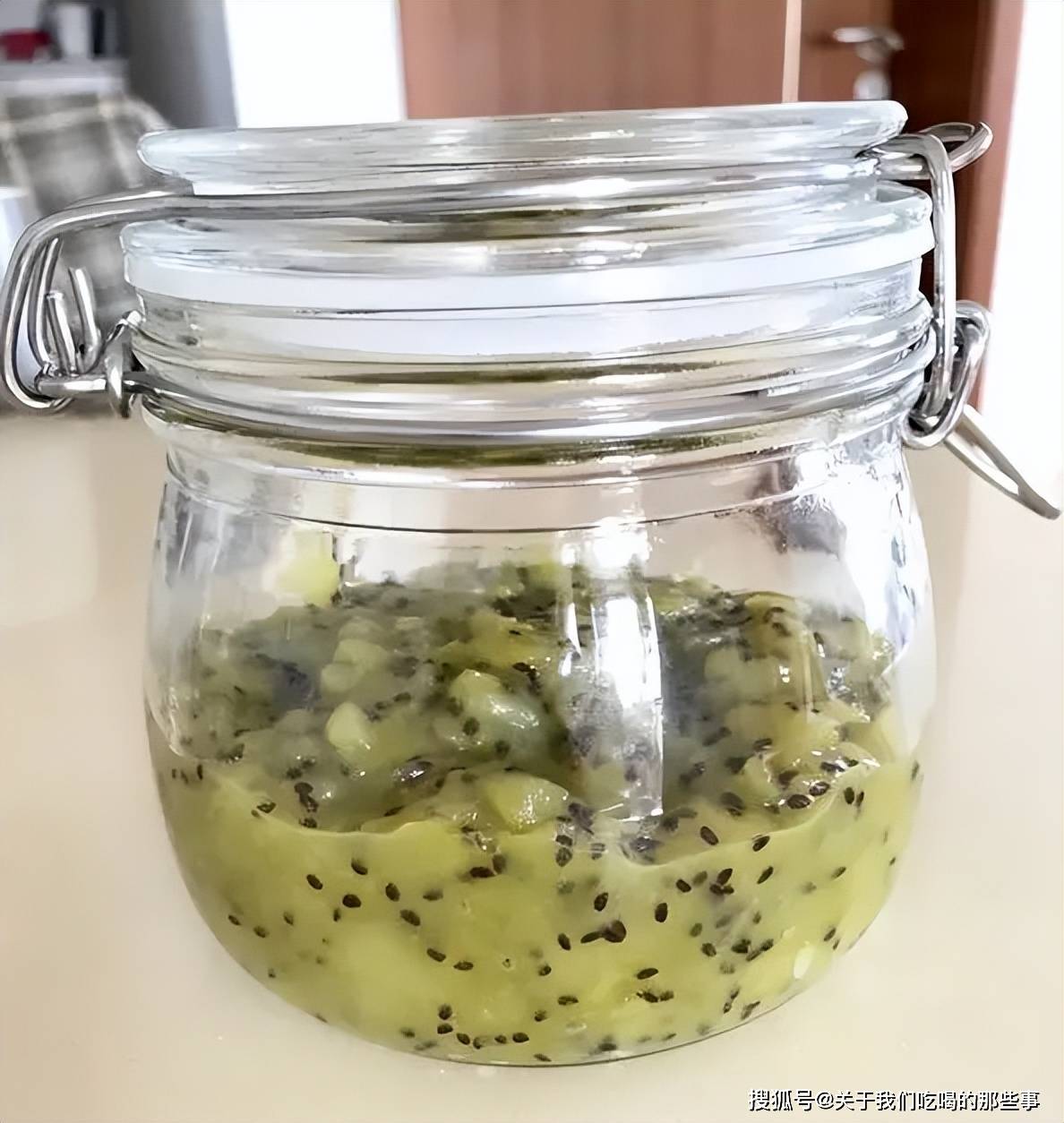 2、开火把汁水煮开,转小火慢慢熬煮,用铲子不停地搅拌,等到水分完全蒸发,汤汁变得很浓稠后,即可关火。把猕猴桃果酱装进无水无油的玻璃瓶里,盖上盖子晾凉,放进冰箱里保存,放半年都不会坏哦。