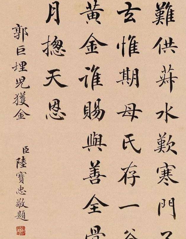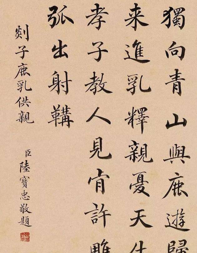 在笔画的排列组合上也是比较疏朗,疏朗并不疏散,相反每个字在笔画上呼应的恰到好处。运笔肥厚有力,落款规矩端正,整幅书法给人平稳之感。陆宝忠的书法虽不能称得上是一等水平,但是也是有一定的造诣,这让一些专业书法家感到汗颜。