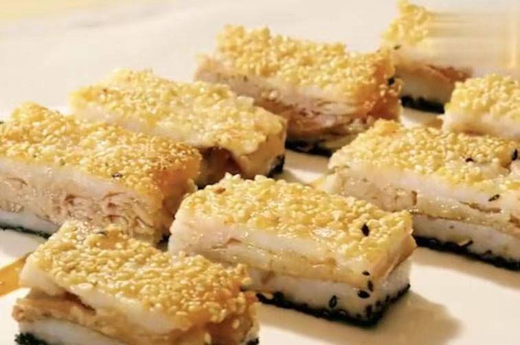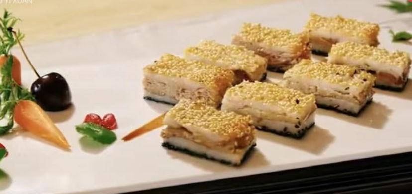 首先就是把麻鸭腌制好,然后上锅蒸,蒸制成熟之后还要拆鸭,去皮脱骨,选出来麻鸭的净肉,还要制虾胶,制生胚,两面撒上黑白芝麻,蒸熟之后下锅炸,多重工序得来的鸭方鲜美无比,丝毫不油腻,尝一口就忘不了!