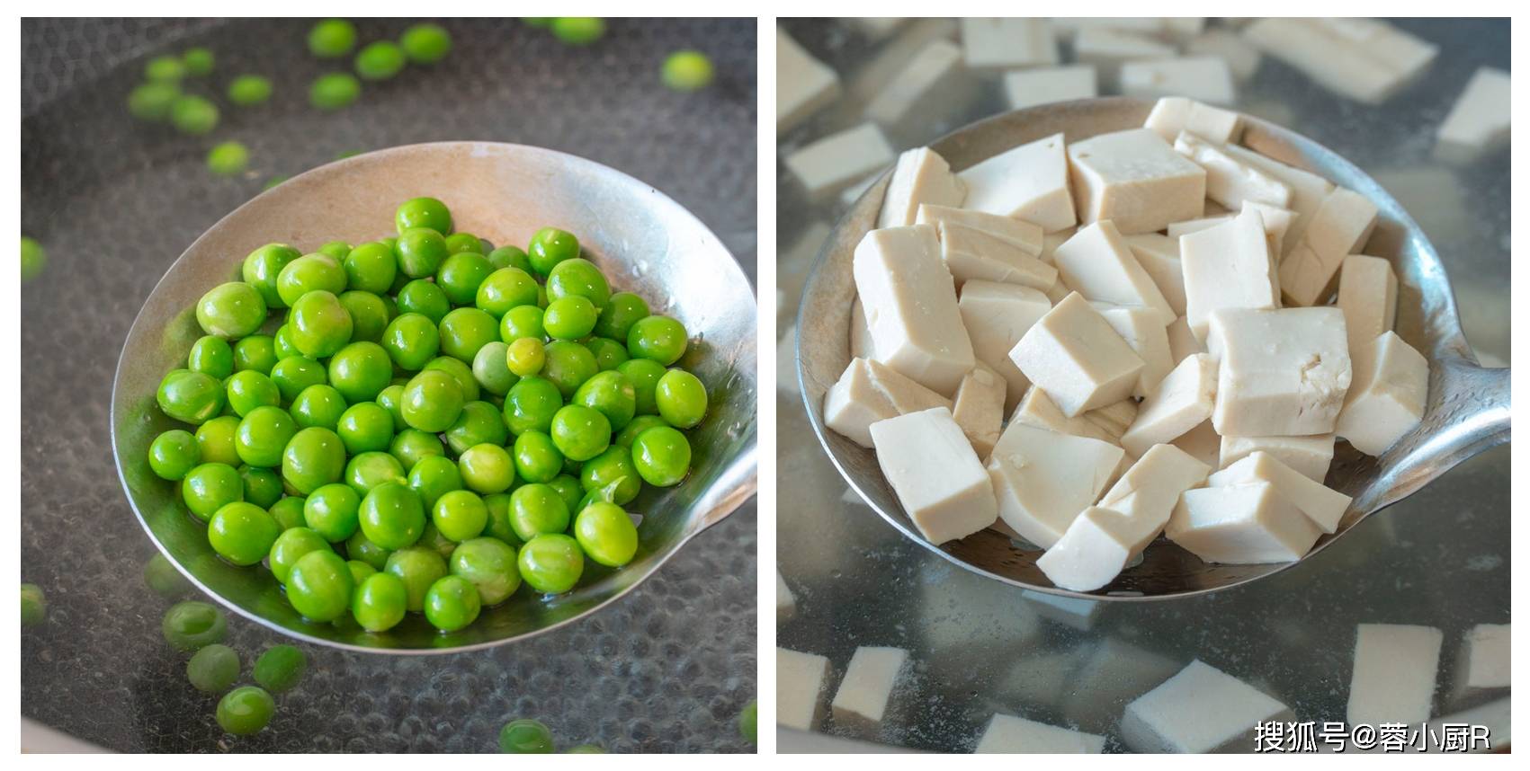 2、起锅烧水,水开倒入豌豆焯水,飘起来捞出来;豆腐也焯一下水。