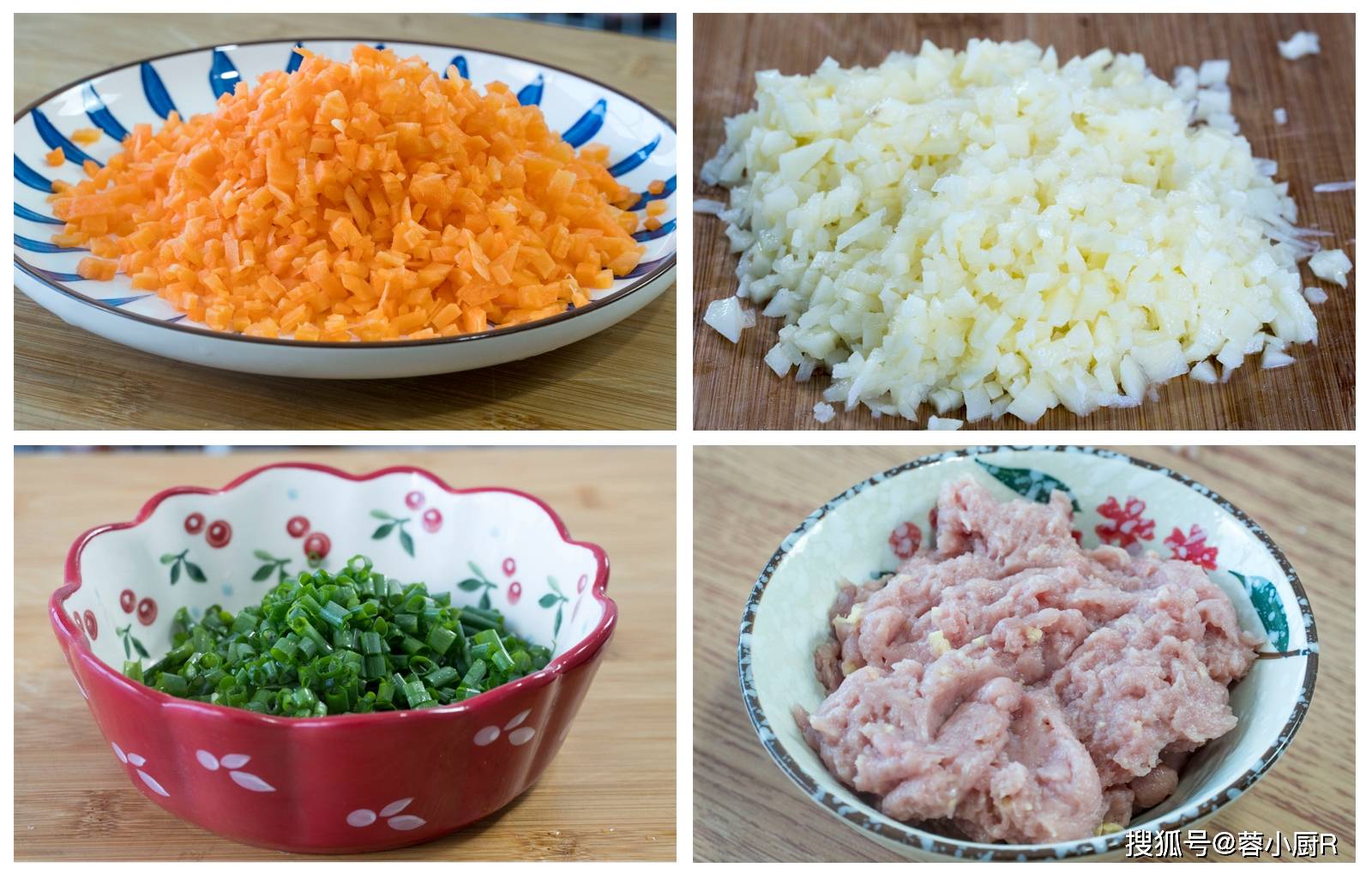 1、一根胡萝卜切成小碎丁;一个土豆也切小碎丁;一把小葱切葱花;