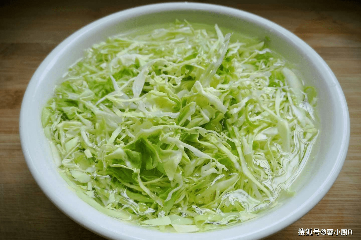 1、包菜从中间切开,去掉里面的硬芯,然后再切成细丝,切好以后放入水盆中,加入一勺食盐,浸泡几分钟;