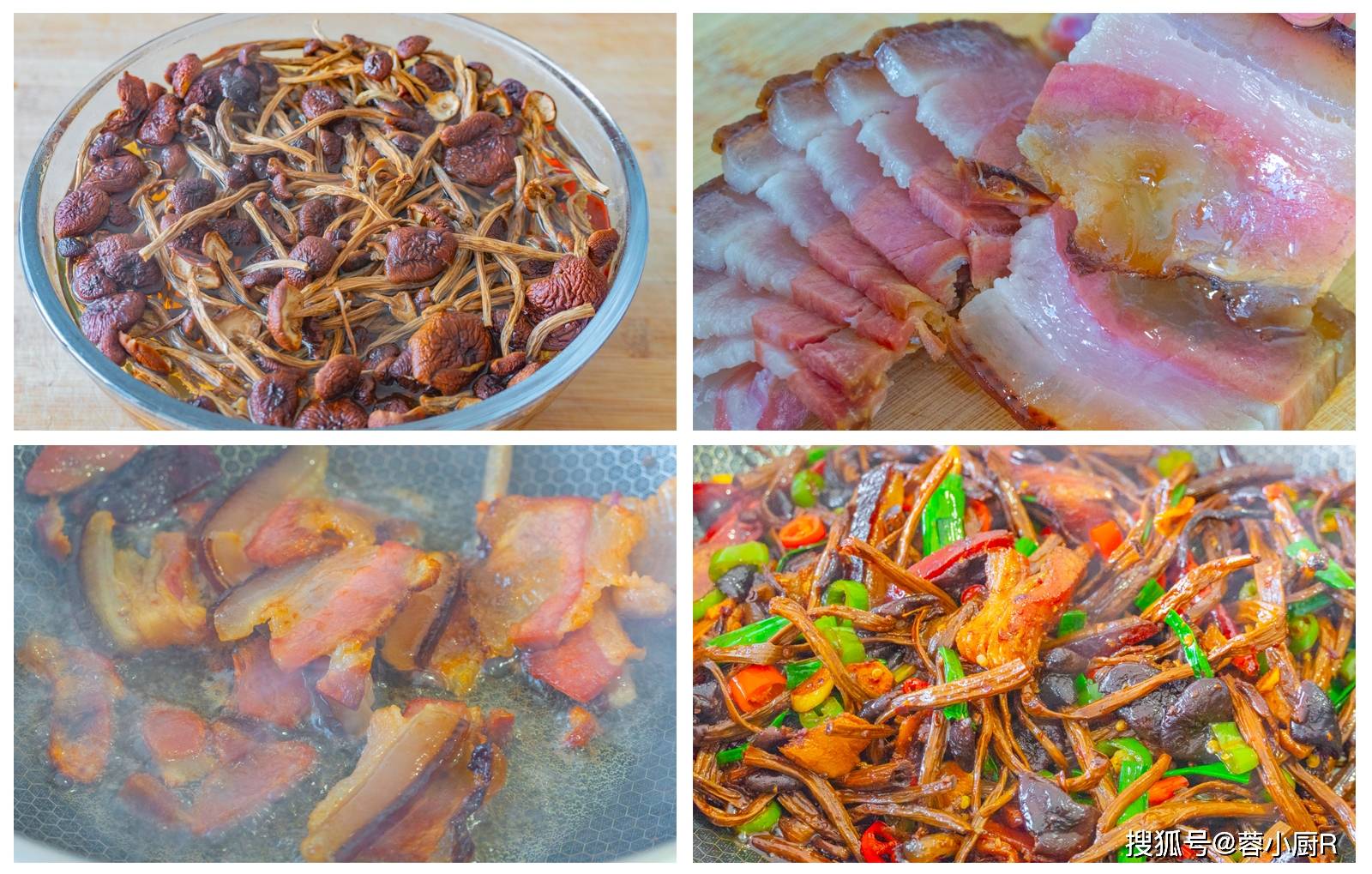 干茶树菇100克、腊肉一块、青红辣椒各3个、蒜苗1把、洋葱1个