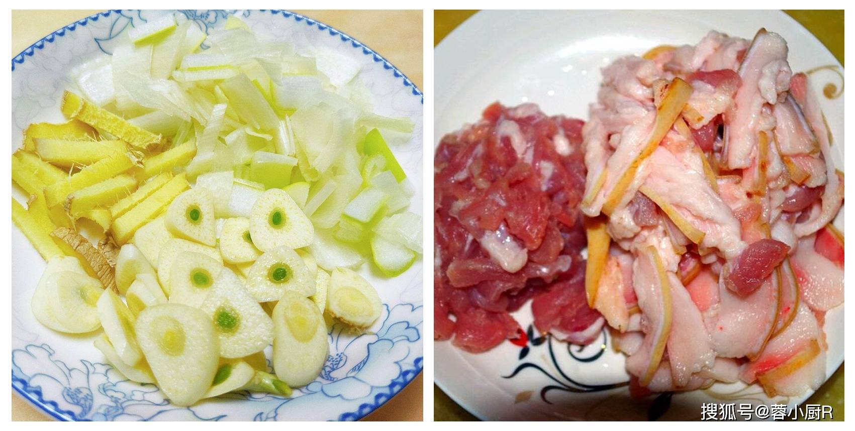 2、浸泡的时间我们来准备配料,大蒜几粒切成蒜片,生姜一小块切成姜丝,几个红干椒切成段,葱一根切成葱花备用。准备一小块猪肉,肥肉和瘦肉分开来切,然后放入盆中备用;