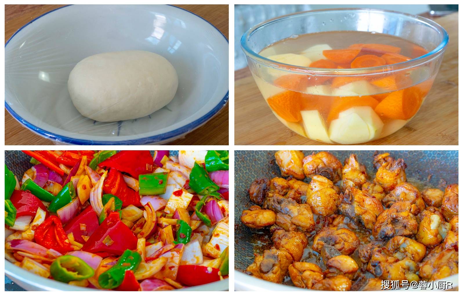 200克面粉、2克盐 、110克温水、6个大鸡腿、1个洋葱、1个胡萝卜、2个土豆 、1个红菜椒、2个青椒、1小段大葱