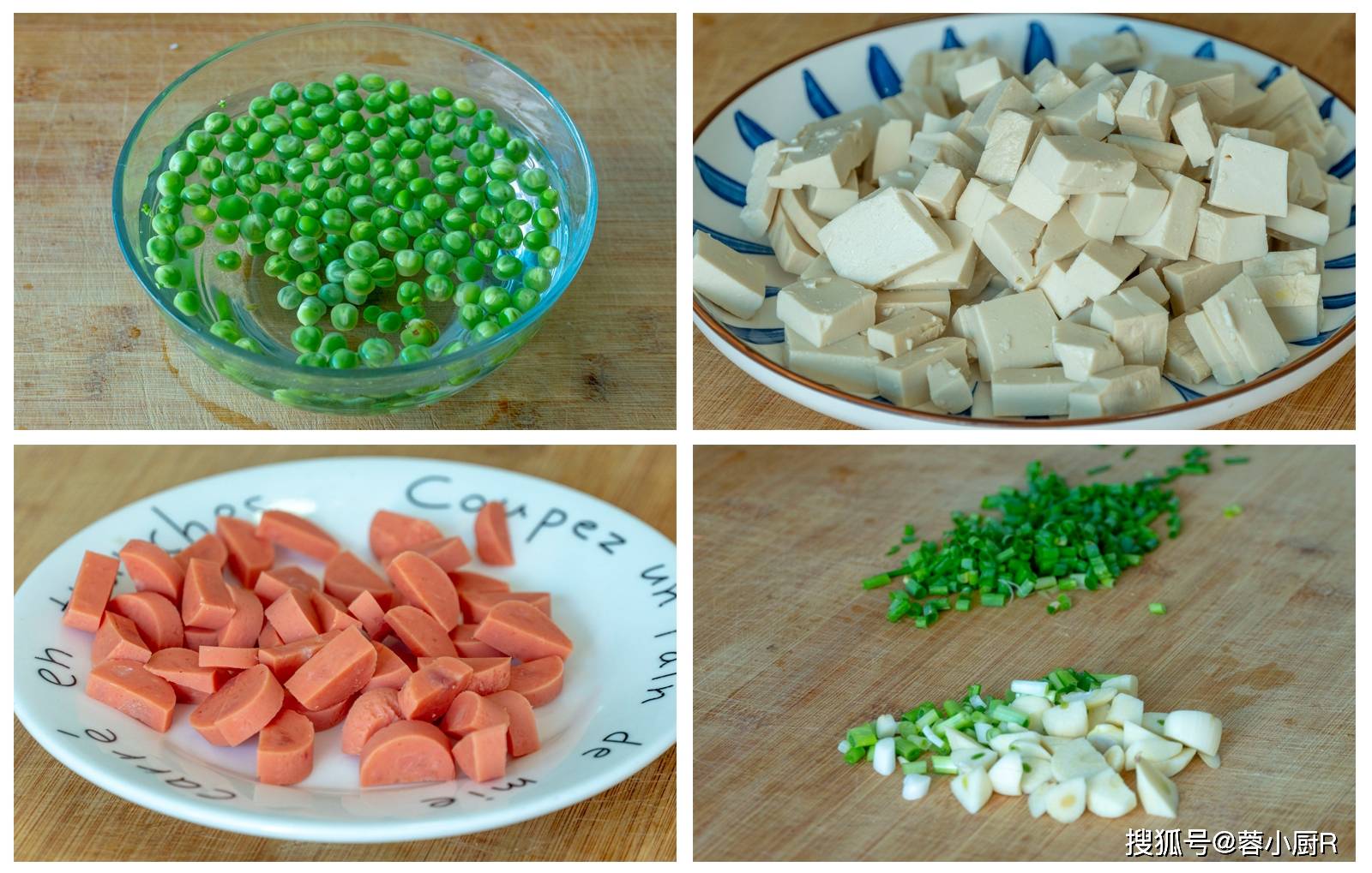 1、豌豆100克;豆腐一块切成丁;火腿肠1根也切成小丁;再切点小葱和大蒜。