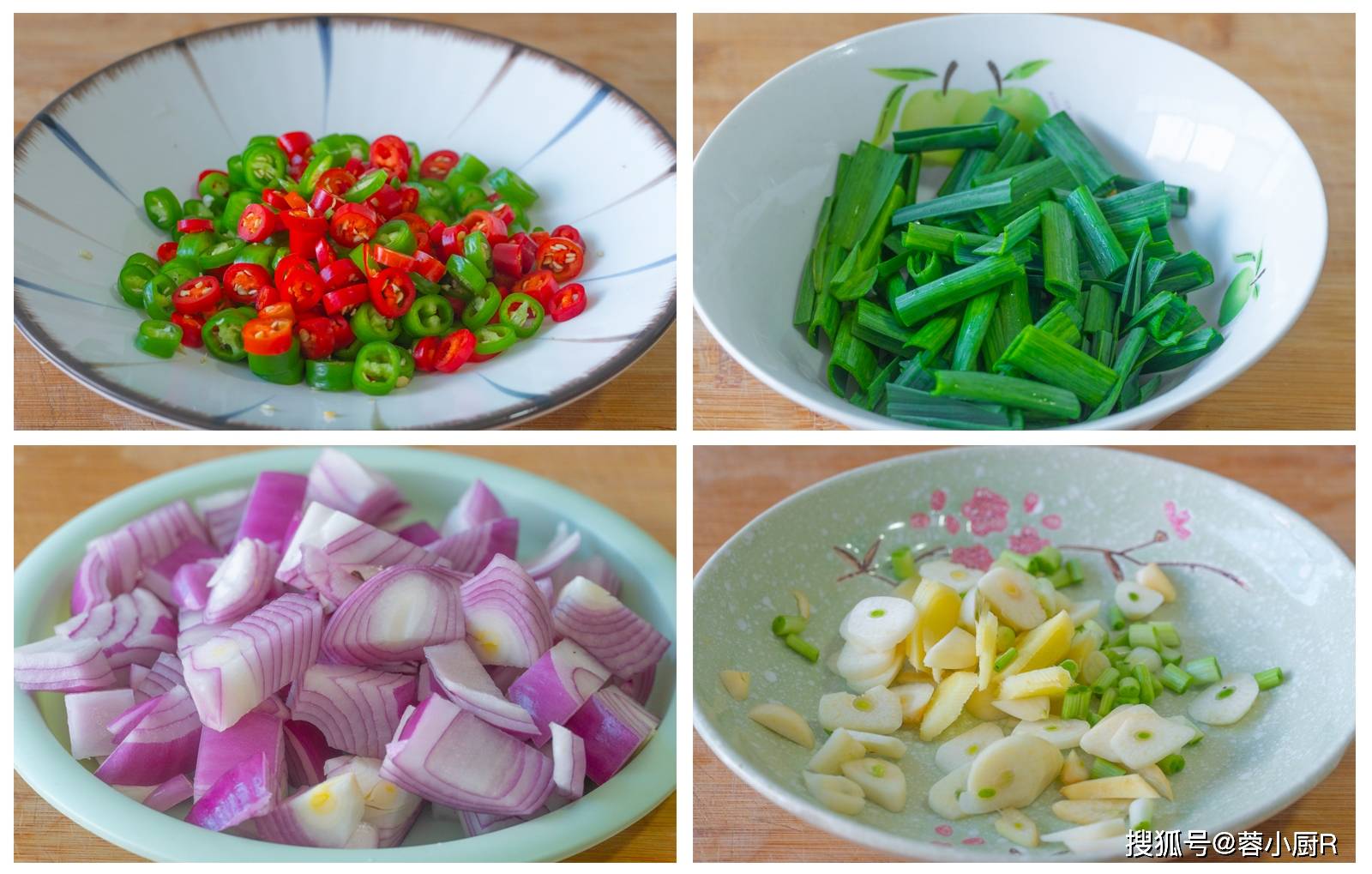 3、青红辣椒各准备3个,切圈;一把蒜苗切小段儿;洋葱一个切大块儿;再切点葱姜蒜;火锅底料一块儿切小一点。