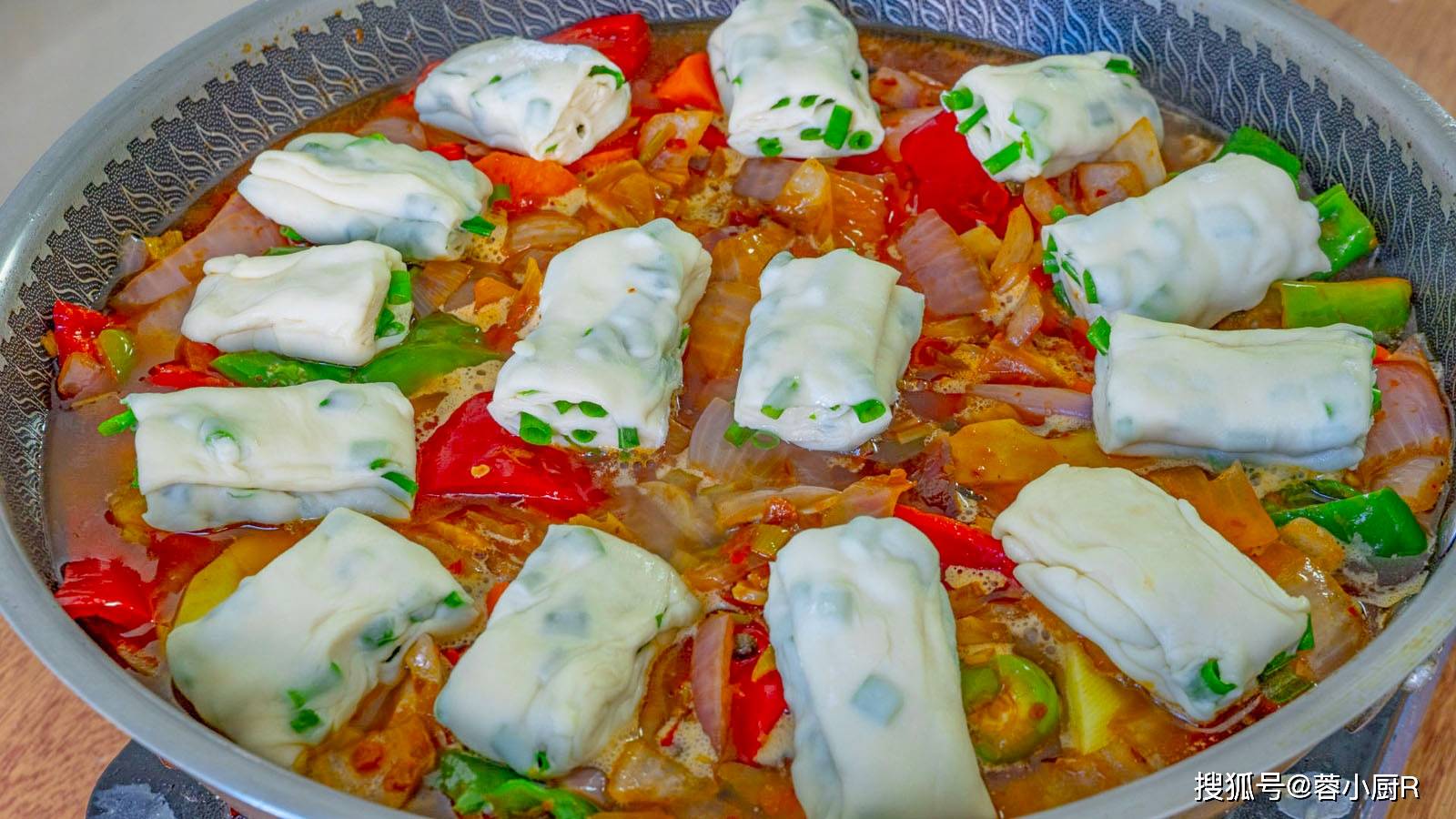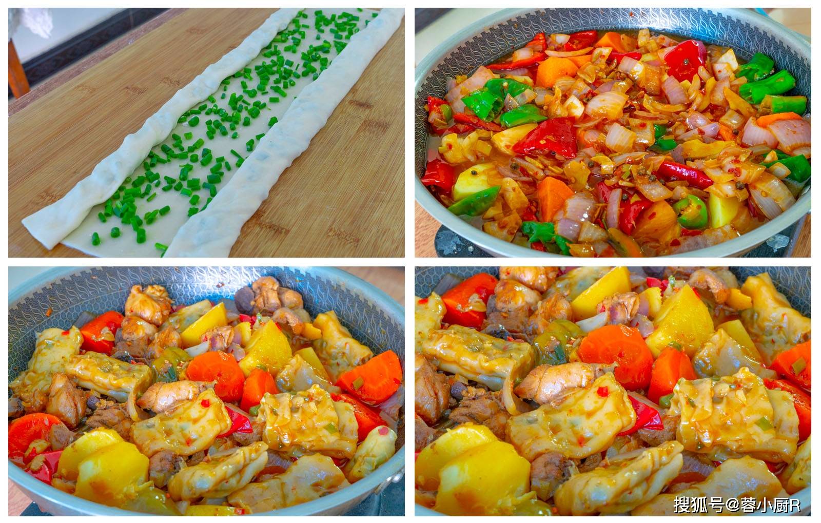 6、鸡肉炖熟倒入土豆、胡萝卜,炒好的菜也都倒进来,最后将面卷铺在最上面,盖上盖子中火煮25分钟左右。大火收汁,但不要完全收干,最后汤汁和面卷再翻炒一下就可以开吃啦。