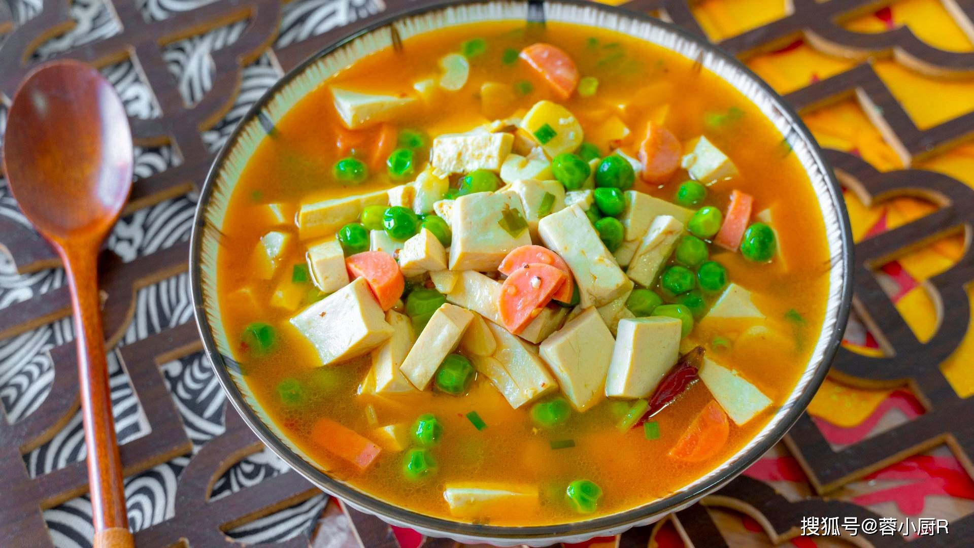 3、起锅倒油,油热加葱蒜干辣椒爆香,再把火腿肠倒进来,倒入一碗开水,煮开后豌豆和豆腐都倒进来,转小火继续煮6分钟。