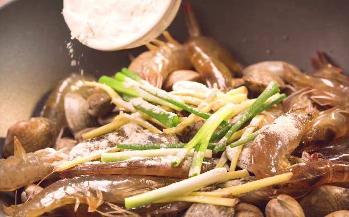 准备一口容量大一点的锅,先把处理好的花蛤和大虾铺在锅底,然后把姜丝,葱段,料酒,盐焗粉均匀的倒入锅中,盖上锅盖,适当颠锅20秒,让盐焗粉和食材完全融合,之后腌制10分钟。