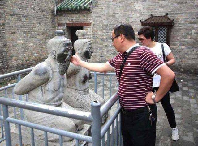 其中最醒目的,便是秦桧与其妻王氏,铁铸的人像历经风雨侵蚀,表面斑驳暗沉,唯有脸颊两侧油光发亮。