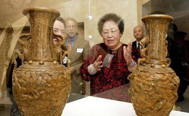更值得一提的是她的文化使命感。从1998年开始,中国紫檀博物馆的馆藏珍品就踏上了海外巡展之旅,先后在美国、德国、法国、意大利、日本、韩国等多个国家和地区展出。她还向德国德累斯顿国家艺术收藏馆、法国国立香博堡博物馆、美国史密森博物学院等世界顶级博物馆捐赠了紫檀艺术珍品。2017年,为庆祝中摩建交20周年,陈丽华带着紫檀制天坛祈年殿和紫檀制松柏交翠亭远赴摩纳哥参展,与故宫博物院、巴黎卢浮宫等十余家顶级博物馆的藏品同台亮相。