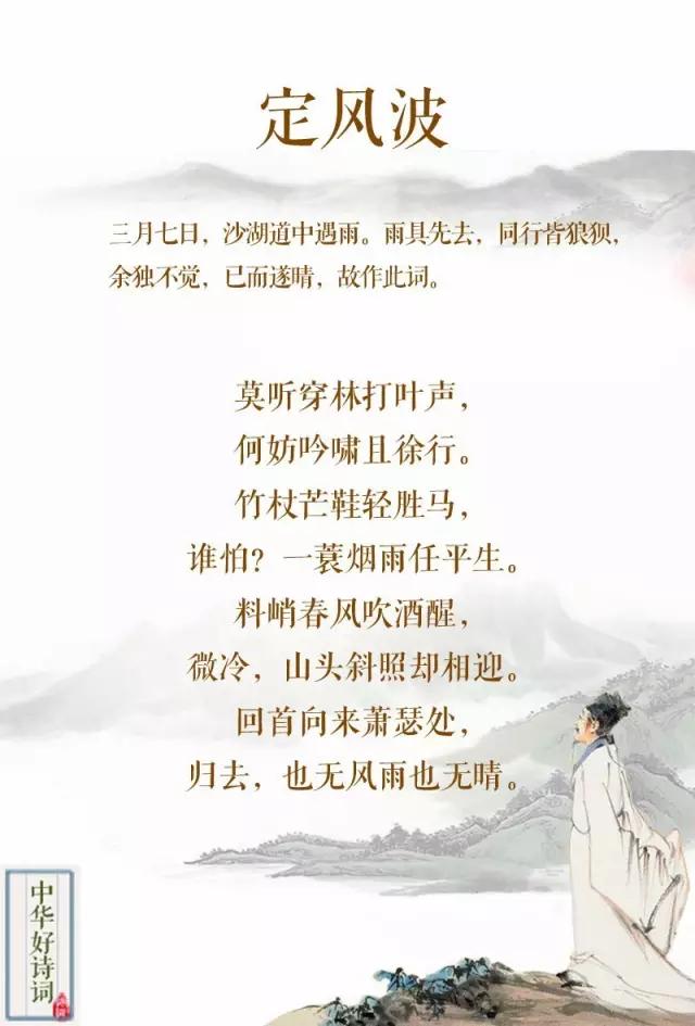 此词通过野外途中偶遇风雨这一生活中的小事,于简朴中见深意,于寻常处生奇景,表现出旷达超脱的胸襟,寄寓着超凡脱俗的人生理想。