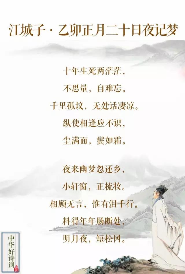 这是苏轼为悼念原配妻子王弗而写的一首悼亡词,词中采用白描手法,出语如话家常,却字字从肺腑镂出,自然而又深刻,平淡中寄寓着真淳,表现了绵绵不尽的哀伤和思念。
