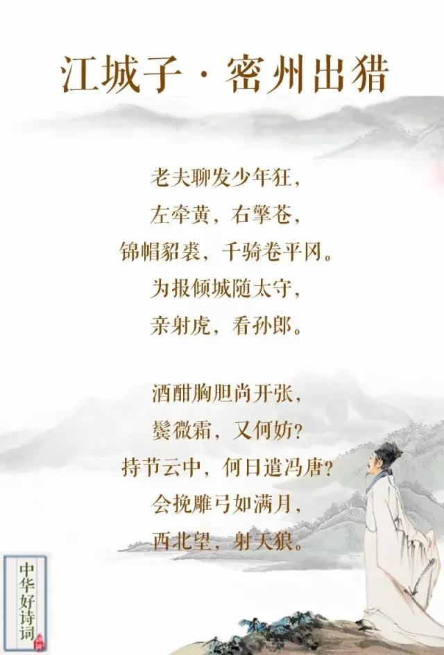 《江城子·密州出猎》是苏轼于密州知州任上所作的一首词。此词表达了强国抗敌的政治主张,抒写了渴望报效朝廷的壮志豪情。