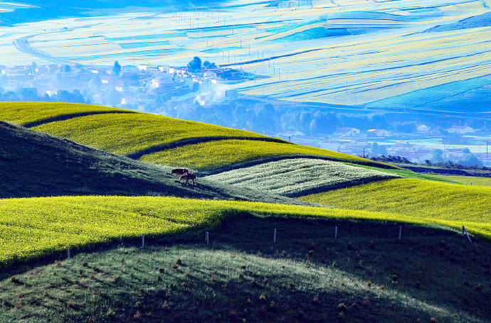 对于祁连我已经比较熟悉了,这是我最喜爱的景点之一,对于他的美的喜欢用四个字来表述:“率真,纯粹”。东方人都比较含蓄。喜欢的景物也偏古典朦胧,比如江南小镇古色古香淳朴隽永,水乡的温婉恬静,五岳三山云雾缭绕的道家仙意,秀美而不张扬,意韵内敛,美要慢慢品,细细回味。祁连则完全不同,祁连美的直接,美的张扬,祁连的天就是纯粹深邃的湛蓝,祁连的云就是高山是雪一般的白,祁连的山就是烈火一样的红,祁连的田野就是不带丝毫杂质的黄绿相间。纯净的色块,由山的褶皱,田间的陇,弯曲的路分隔的象色彩艳丽调色版。色与色之间绝不相连,绝无暧昧,一眼望去便如色彩浓丽的油画,饱和而细腻,个性面奔放。直接而热辣。土生土长在东方古国,受古老的汉文化影响进骨血的我,这种泼啦啦地闯入眼底的鲜丽,让人得缓一缓才能消化。