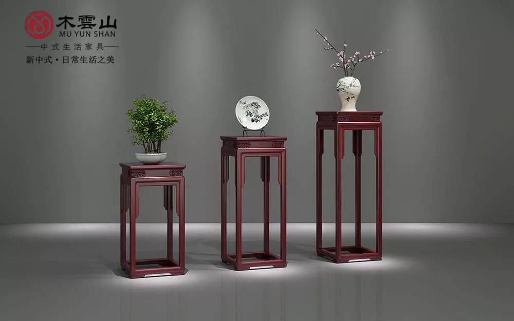 木雲山·明韵花几(图为东非酸枝所造),造型上高雅舒展。四面平式,粽角榫交接,挺拔高洁。面板光滑,四腿方正。造型上下呼应,增加美感,亦大大提升了花几的稳固性。