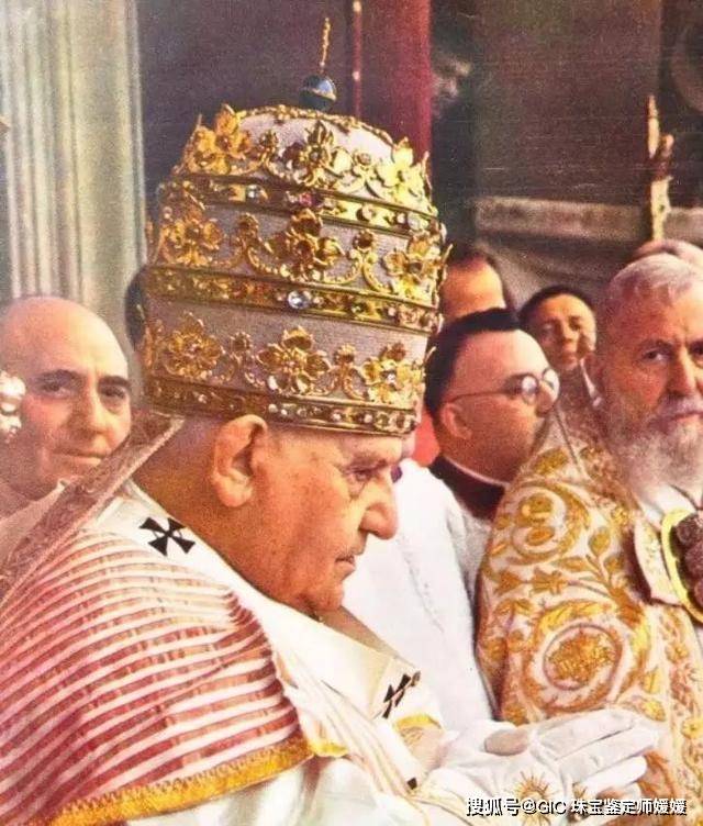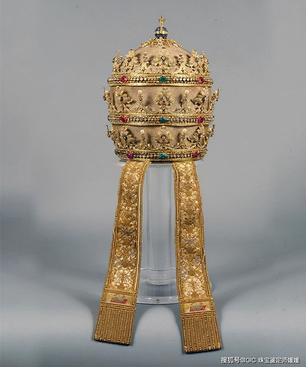 这是宗教的一顶法器,名叫三重冕,是宗教为了显示自己地位和权利,而专门定制。这顶法器,底部是用金布装饰,颈部上面绣上一些十分高雅的花朵。三重冕每一层都是由树叶图案组成,在周边镶上一圈钻石,然后中间是一颗巨大的祖母绿宝石,左右各镶上一颗红色宝石。顶端是一个十字架,十字架下面有一个圆球,象征着天堂的辉煌景象。