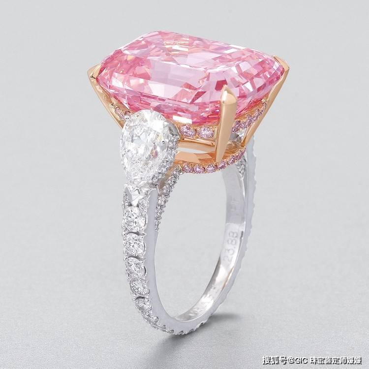 后来格拉夫重新设计了这枚粉钻的戒托,用黄金色的基座来衬托粉钻粉色的色彩,从而显得更加的温暖。在戒托的周围用小颗的圆形明亮切割粉钻来勾勒基座的轮廓,加上两颗大水滴钻石的点缀,使得这枚粉钻戒指唯美而独特。