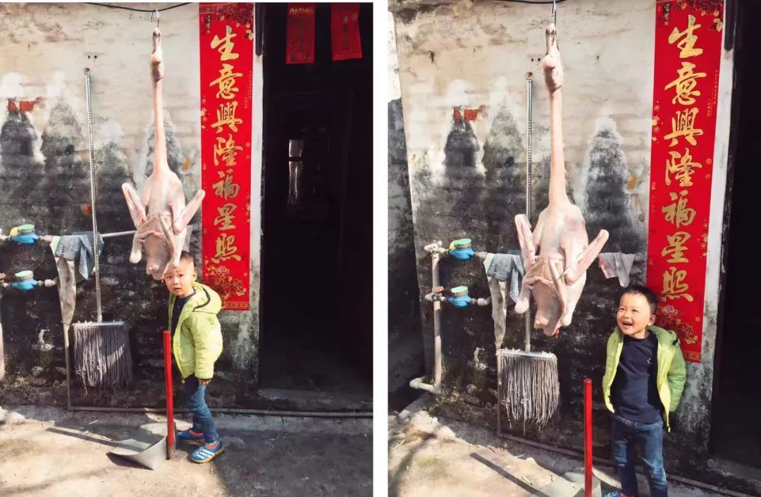 “2017年那年过年,在老家广东江门鹤山过,老家的大伯最擅长碌鹅,侄子一开始看到挂着的大鹅被吓到,后来就开心地笑了起来。”